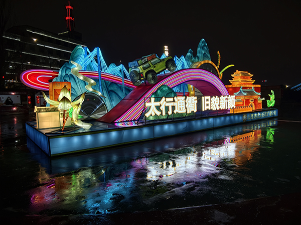 由山西交控太旧改扩建公司打造的“太行通衢 旧貌新颜”主题灯组,则生动展现了阳泉交通发展的变迁。灯组以现代交通建设成就为脉络,将太行山水与地域特色融合,在光影变幻中向市民及游客展现了太旧高速改扩建工程带来的城市蝶变,传递出阳泉在交通发展中奋勇争先、续写辉煌的坚定决心。